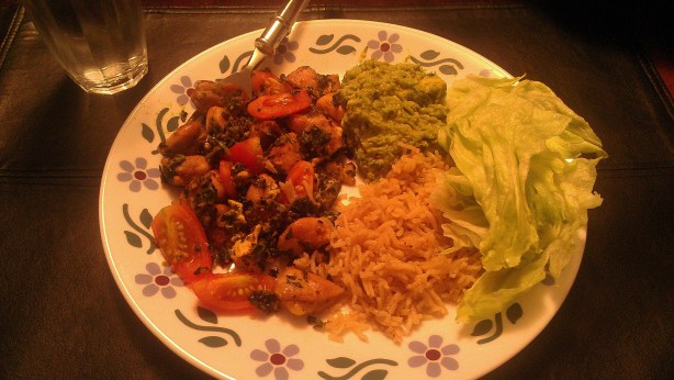 Here you have some of the premarinated chicken that I keep in the freezer. I sautéed it in extra virgin olive oil with a handful of spinach. I added an egg and some chili powder to it. I mixed it all up as it sautéed on the stove. When there was about 10 minutes left before Iftar, I cut up some tomatoes and put them on top with the stove turned to the lowest setting and let it sit. Once it was time for Iftar, I opened my fast with a date. This is how Muslims traditionally open their fast and is usually the first thing I’ll have. I added some rice (not so Paleo I know), lettuce, and the gauc I made to my plate for a satisfying dinner. For dessert, I had a nice amount of watermelon mmmm. This is how it turned out:
