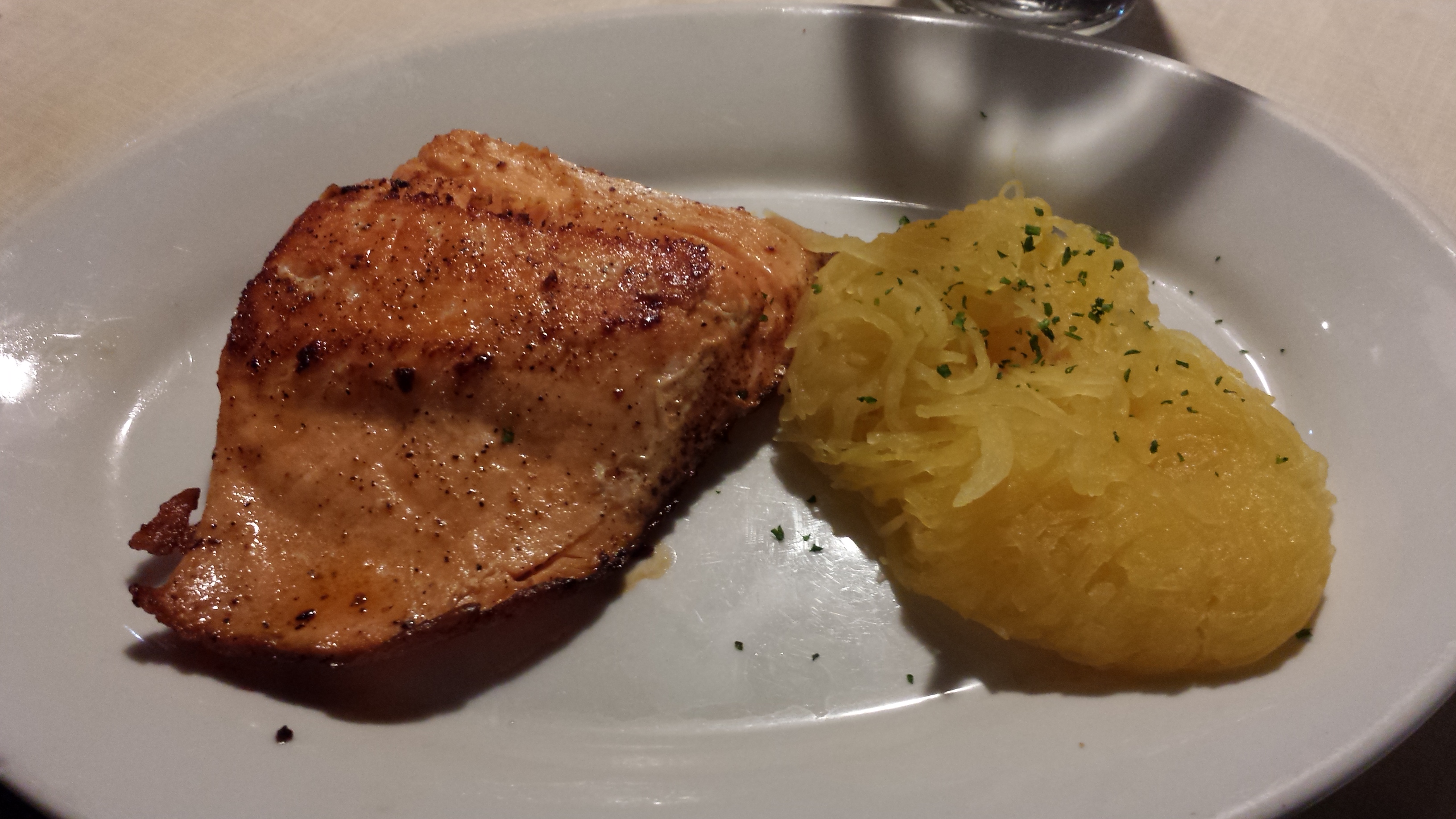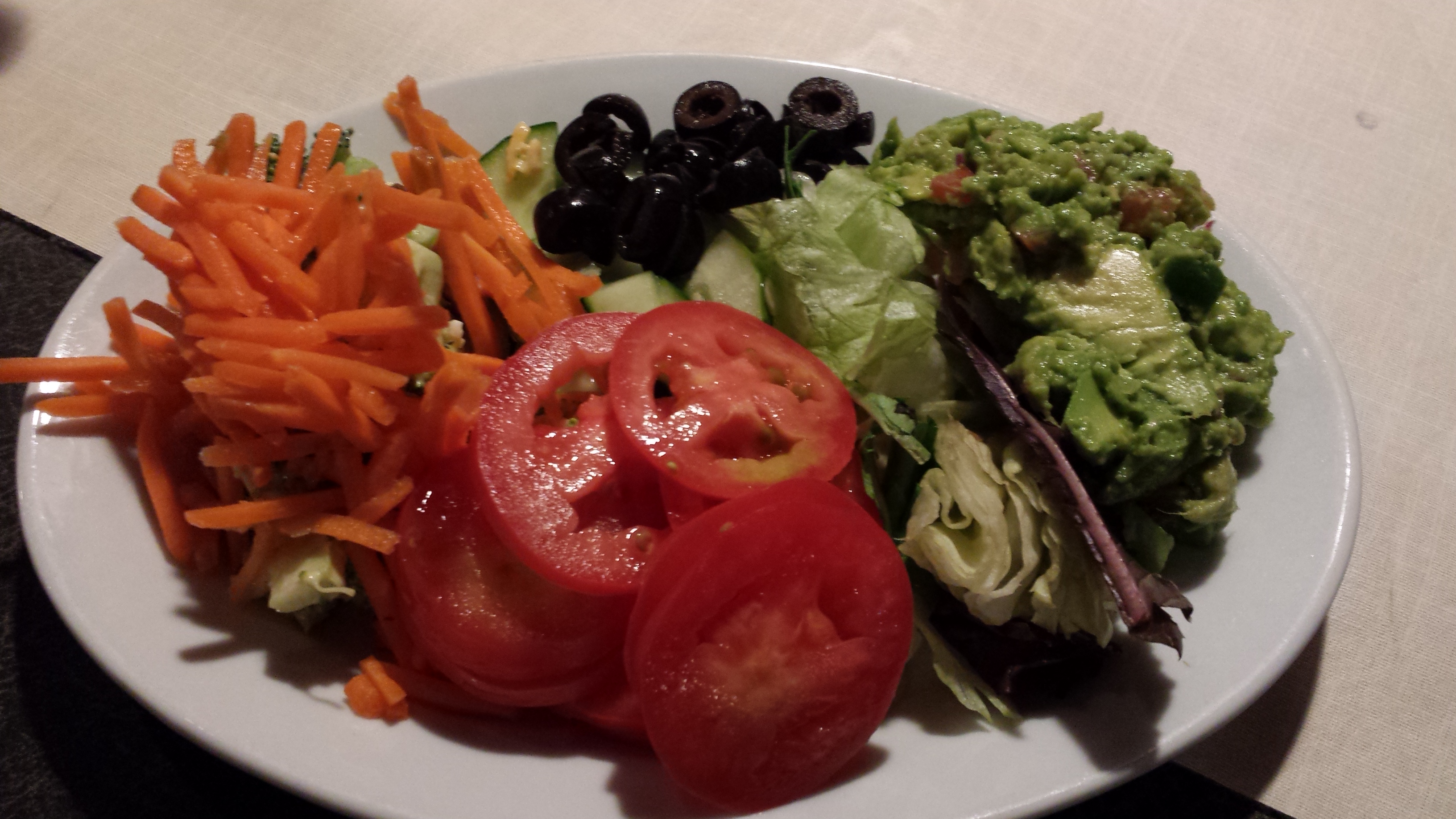 I had looked at the menu ahead of time so I knew what to get. A little Google help and you can see what goes into the grilled salmon that I went with. It was lightly marinated with salt and pepper and some lemon. It was grilled and served with shredded squash. I had a side of salad with guacamole as well.